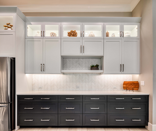 Feast your eyes on our latest project example – a stunning light, airy grey custom cabinetry with a built-in wet bar, skillfully crafted by Rutt Quality Cabinetry.