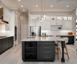 Bright, timeless, and tailored to perfection—this custom kitchen project is a perfect reflection of the Monogram Cabinetry difference. Designed for a modern Sarasota home, the space features crisp white upper cabinets that lend an airy, light-filled feel, making the room feel open and inviting.